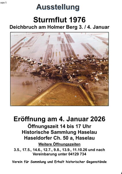 Eine weitere Ausstellung in Haselau, durch den "Verein für Sammlung und Erhalt historischer Gegenstände" rundet das Erinnern ab. Den Flyer dazu und Informationen zu dem, die Sturmflut auslösenden Orkan "Capella" wurden dafür erstellt.